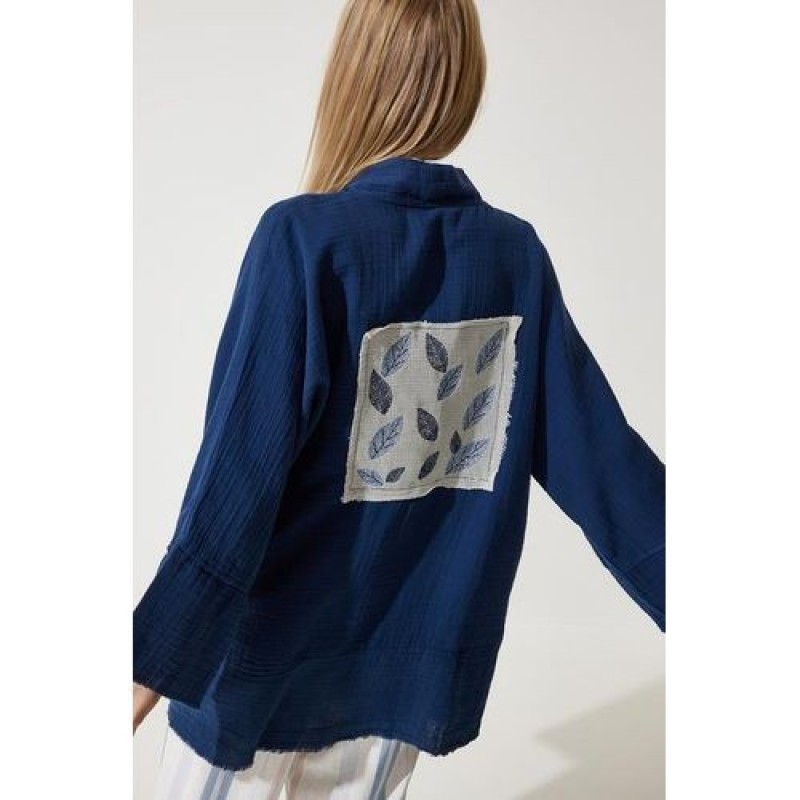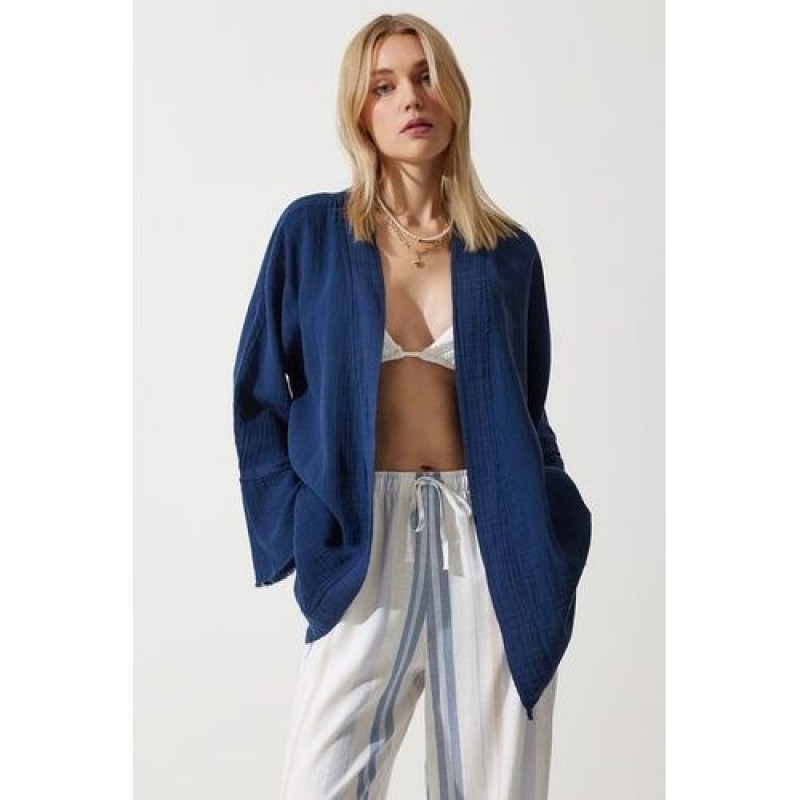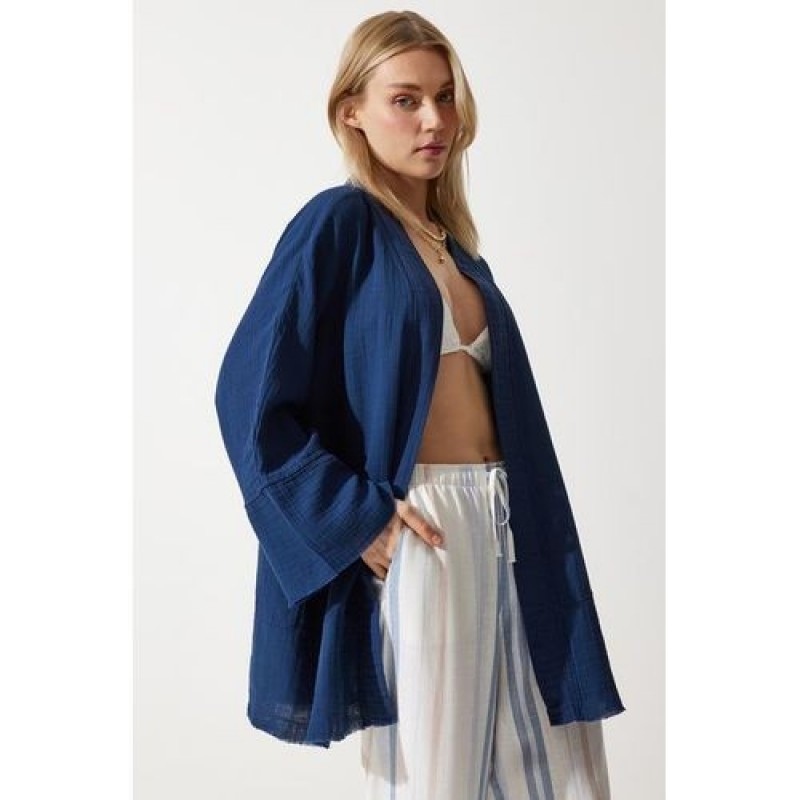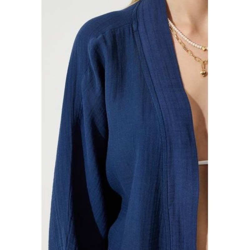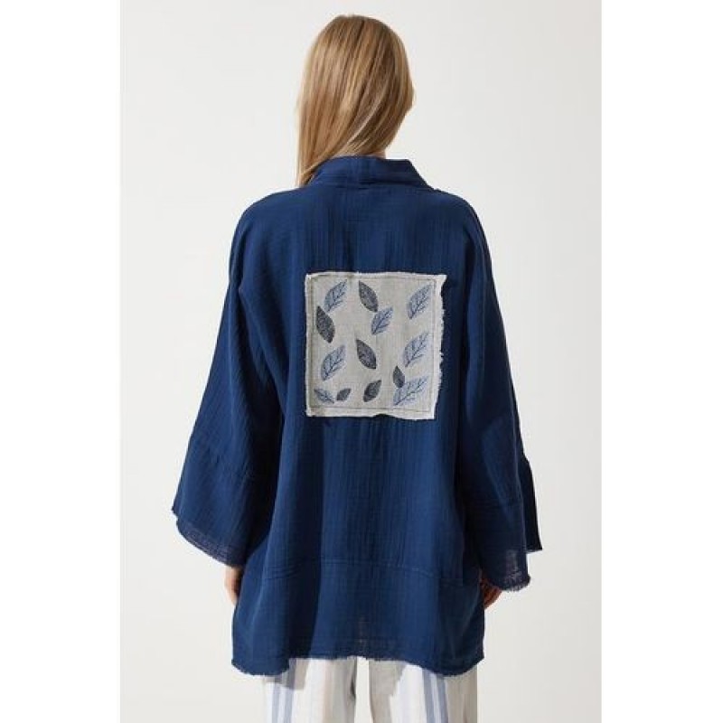 Trendyol Women's Navy Blue Floral Detailed Premium Muslin Kimono